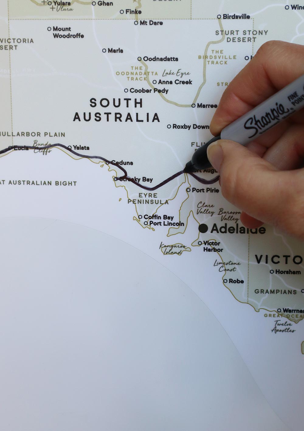 I decided to design my own! A map that's minimalist, but includes all the essential landmarks, regions, iconic drives and 4WD tracks. A size that makes it easy to visualise a trip, and at a price that means you can order a couple. The paper version is handy to sketch ideas on, and the sticker version is for the walls of your van or motorhome.